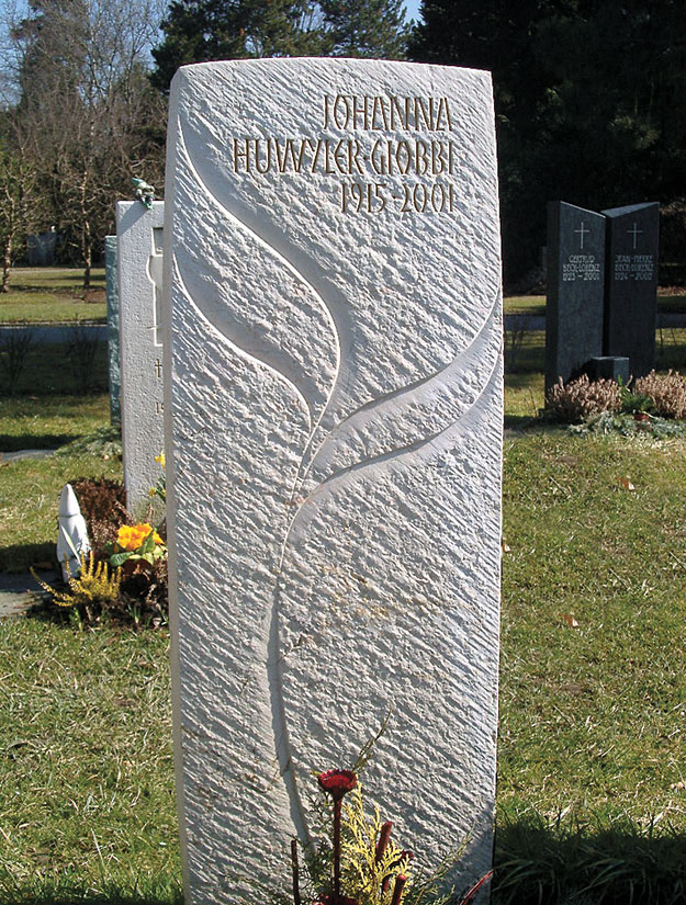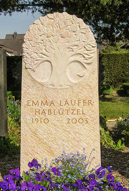 Ein Grabstein mit Baum, Bäume, Tanne sowie ein Grabstein mit Blatt, Blätter, Ranke, erinnert an das Leben und den Kreislauf. Die Blätter im Frühling kündigen das neue Erwachen des Baumes an, und im Herbst symbolisieren sie den Kreislauf des Lebens.
