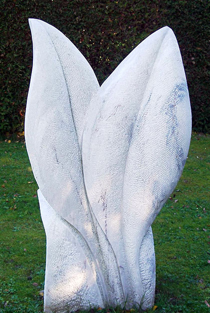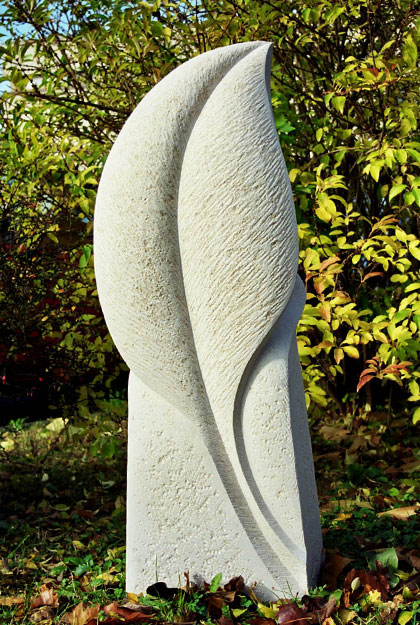 Organisch geformte Grabstein Skulptur. Zwei Halme oder Blätter als Symbol für Werden und Vergehen. Inschrift vertikal der Form folgend.
