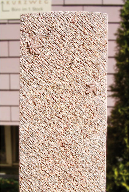 Organisch geformte Grabstein Stele (Halm, Blatt). Flächen naturbelassen, bruchroh. Inschrift vertikal der Form folgend.