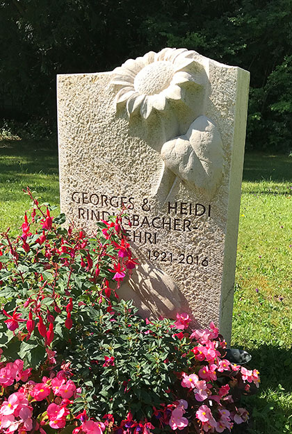 Grabstein mit zwei Sonnenblumen im Relief. Handwerkliche Bearbeitung. Solothurner Kalkstein.