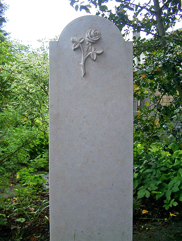 Grabstein mit gravierter Rose, oben asymmetrisch abgedacht.