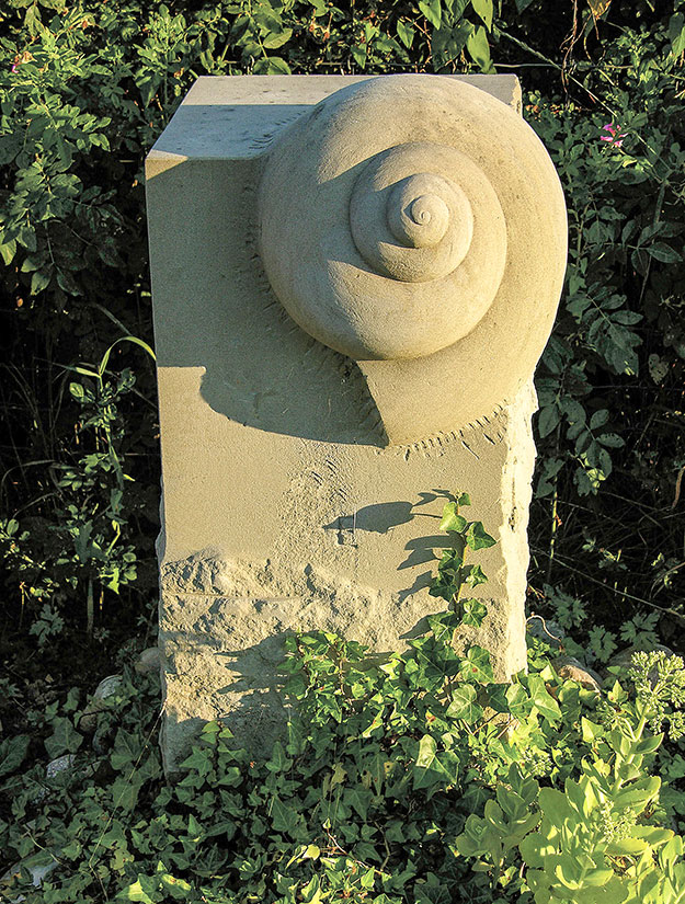 Grabstein mit Spirale. Organische Form. Symbol für den Kosmos und das Leben.