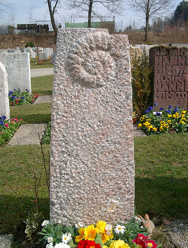 Bei Grabsteinen sind Spiralen und Ammoniten häufig verwendete abstrakte Formen. Sowohl die Spirale, als auch die Form des Ammoniten symbolisieren Ewigkeit und thematisieren damit sowohl die geistige Unsterblichkeit, als auch die ewig andauernde Liebe und Zuneigung der Hinterbliebenen. Die Spirale und auch die Kreisform der Ammoniten scheinen bei näherem Betrachten des Grabsteines nie zu enden.