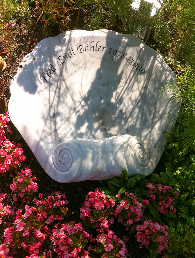 Die Spiralen und Ammoniten als häufig verwendete, abstrakte, künstlerische Form des Grabsteins, als Symbol für Ewigkeit, Unsterblichkeit, ewige Liebe und Zuneigung der Hinterbliebenen.
