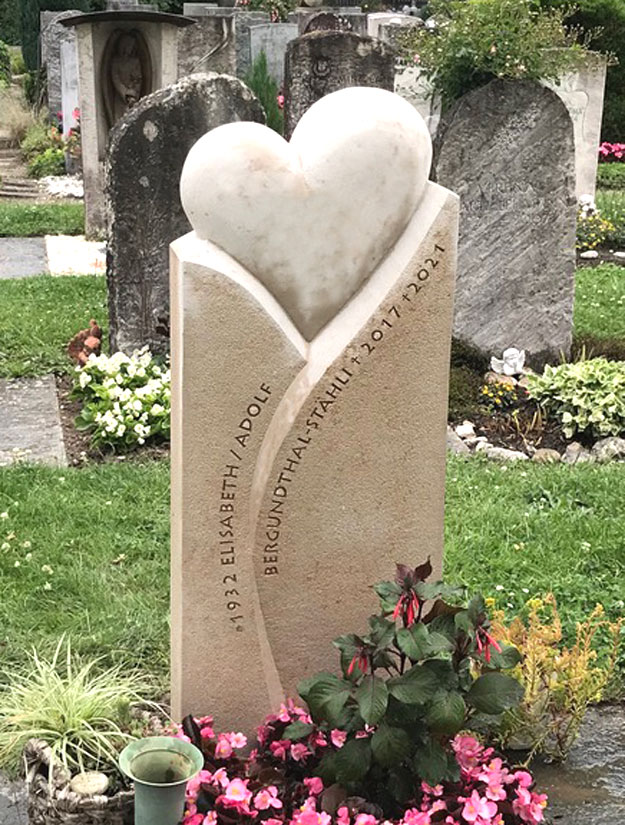 Grabstein zweigeteilt mit Herz und Lebenslinie. Organische Form.